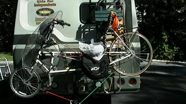 I'll be riding a Tour Easy recumbent made by EZ Racers in Oregon. Mine is white. More on this incredible bike latter. This is the bike on the back of the motor home. |