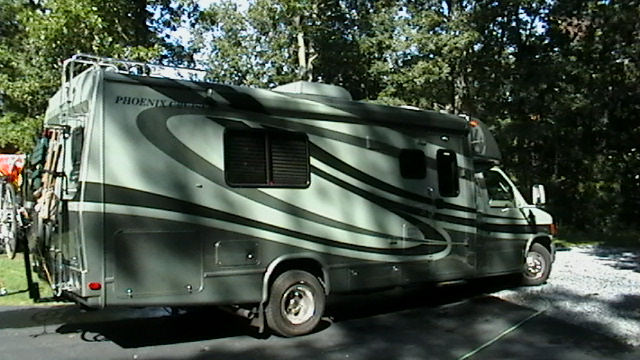 We've had three motor homes. The most recent and perfect for this adventure is the Phoenix Cruiser model 2551. This is the floor plan, but we have an electric couch that we sleep on instead of the dinette. We love this motor home. It is easily maneuvered and we can park it on streets in down towns. It provides a lot of walk around room and visually is much larger, although it is only 2 feet longer than our small Phoenix Cruiser. Visibility is fine. This is the heavy duty Ford E 450. I think the heavy duty is a must and I would not buy another without it. Its has a far better ride, less jangling, far better braking, and it is surer steering and road tracking. The wheel base is 40 inches longer than the E 350. Although the turning radius is a bit wider, it provides a really good ride and feel. Before this one, we had the a blue version of the Phoenix 2523, but it was too small. Our Allegro Bay, which we started with, was too large and chunky. We pulled an F 150 to carry our bikes and total rig measured around 63 feet. Ugh. |
