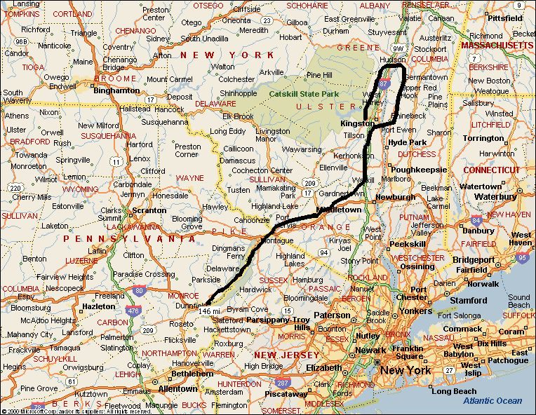 Bear CountryI'll post the New York photos soon. In the meantime the links above give you the cities and towns we rode through. Here is the map of our first ride. I started the ride in Saugerties, New York, just north of Kingston, rode north, crossed the Hudson River at Catskill/Hudson, and rode south the Rhinebeck. I started the next day in Kingston, and road south through New Paltz and Shawangunk to Daawfkill, a one building town. There were lots of ups and downs. From there the next morning I rode through Middletown to the Port Jervis area (I had to skip about 10 miles of the steepest climbs as I was simply not in shape to do them). From Port Jervis the route took us along the Delaware, through bear country, and we stopped this segment at the intersection of Interstate 80 and the Delaware River.
