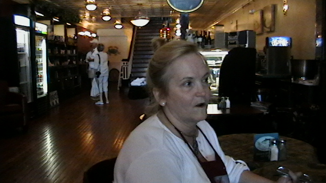 me some. Here is one from their web site: And another of the mezzanine: This coffee house is just fantastic. It is a restored building with pannelled walls like I've seen only in bank board rooms. It two stories with a grand stairway to what they call the Board Room on the second floor. Every detail is done exquisitely. When Roberta purchased the store, the developer had a slew of contractors working on various details and it shows. It is perfect. Roberta tells me that folks come great distance just to see the building. Its been written up in the NY Times. Once there you have to try the Tomato Bisque and the Caesar Salad. But leave room for the Coconut Cake. Roberta is a master baker and it is delicious, moist and rich. Cathy had Crab Cake, in her words "truly the best crab cake I've ever had". And Cathy has had a lot of crab cakes. The sane is true of the potato salad, which I might add she did not share with this writer. Cathy deserves it for all the work she has put in to insure the success of this trip. So here you have an owner who moved from Sedona California to open this store, who drove across the Chesapeake Bay Bridge Tunnel despite a fear of doing so, purchased a home and then selects what I think is a store in the top ten across the nation, and then learns the business on the run. Her son and husband are supports but this is Roberta's business. Every customer that entered the store was greeted with a handshake or more personal salutation when they were obviously well know to Roberta and Dawn. The service was prompt, the food excellent, the decor I can't say enough about, and a terrific iced coffee, brewed strong so it stood up to the ice through our meal, which I finished with a double espresso. Roberta has a great deal of inner strength. She shared some personal situations which I'm certain created more stress during her opening, but she got it done expertly, and, to her surprise, fifty local friends and acquaintances spent personal time helping her through what I'll call 'the troubles'. Well I'll be in touch with Roberta to hopefully get some good pictures of the store. You will love it. And, finally, the Eastern Shore Coffee Store Owners again raised their head. I think it was Amy Betti who first referred me to Cape Charles Coffee House, and I thank you Amy. Its a pleasure to see fellow coffee professionals helping out each other.